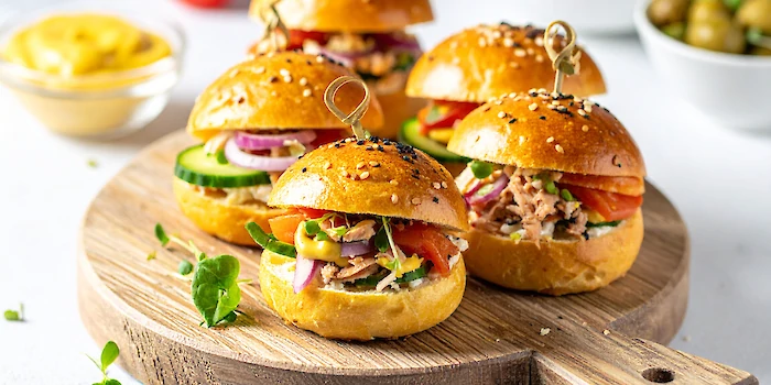 - Brioche bun met tonijnsalade, kappertjes en olijven