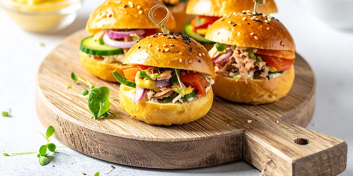 Een mini brioche bun is een klein, zacht en licht zoet broodje dat gemaakt is van briochedeeg. Onze mini buns zijn luxe belegd met verschillende soorten toppings. Een hip en lekker hapje als keuze voor jouw borrel.