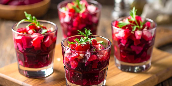- Glaasje met salade van rode biet, zoetzure sjalot en balsamicodressing - vegan